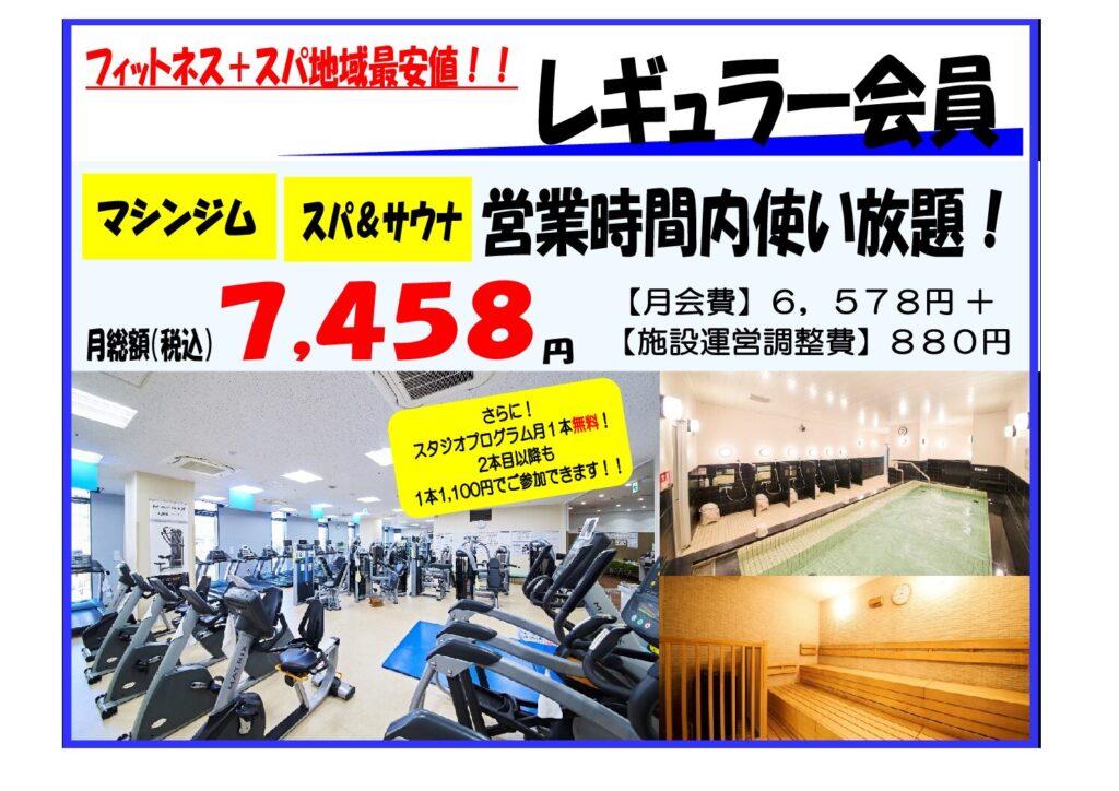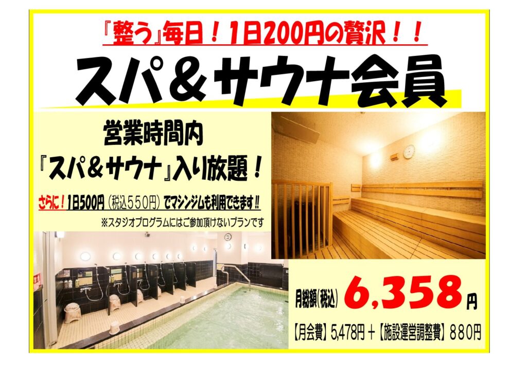 マシンジム、お風呂、サウナに加えスタジオレッスンも参加無制限です!!