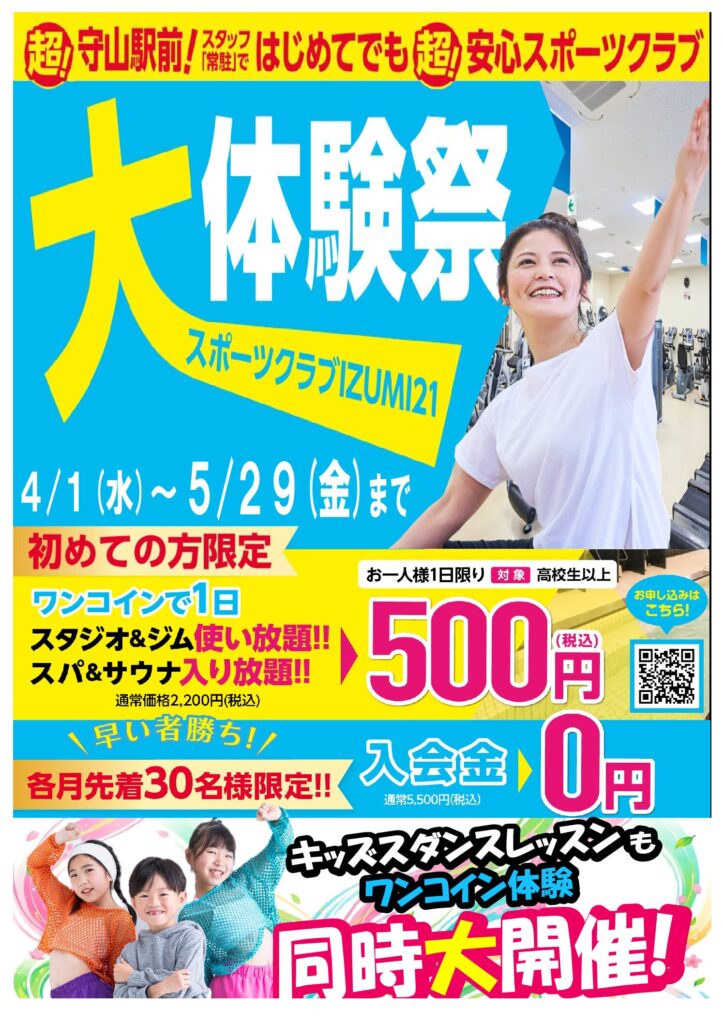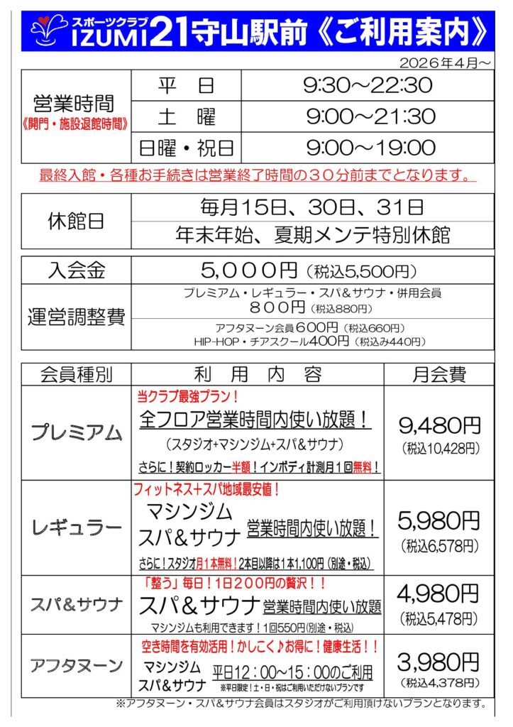 スポーツクラブIZUMI 21はJR守山駅より徒歩1分とアクセスが良好で、広々快適な空間と、充実のスタジオレッスン、最新機器が揃うマシンジムなど、健康重視の方もウェイトトレーニング重視の方も無理なくご利用いただけるアットホームなスポーツジムです。